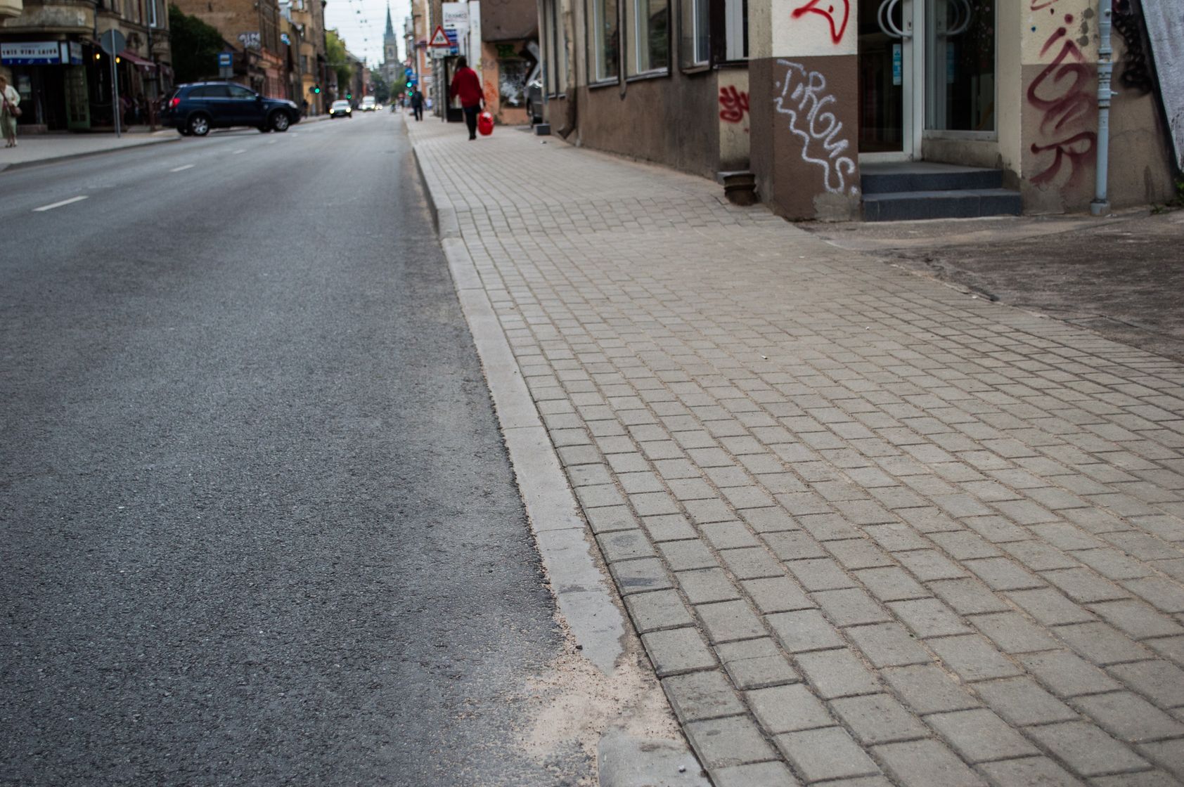 Pagājušajā nedēļā Lāčplēša ielā no ietvēm tika izlauzts asfalts un tā vietā ietve tika nobruģēta. Par šī bruģa labajām un sliktajām īpašībām šoreiz nerunāsim, bet parunāsim par ko citu – par to, kādā profilā tika nobruģēta ietve pie ēku vārtrūmēm un iebrauktuvēm blakusteritorijās. Ja vēl pirms bruģēšanas ietve bija vairāk vai mazāk līdzena – slīpums, kas paredzēts, lai automašīna varētu uzbraukt uz ietves, bija tikai pie pašas brauktuves: