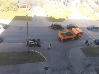 Paralēli tam ielu mazgāja arī īpaša mašīnīte, kurai teorētiski iela būtu jātīra ar t.s. slapjo mazgāšanu, bet realitātē aiz mašīnītes pacēlās liels putekļu mākonis, kas mēroja taisnu ceļu uz blakus esošo bērnudārzu, kur tieši tobrīd rotaļājās bērni:
