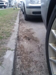 Lai gan iela bija tīrāka nekā aizvakar, tomēr tajā joprojām vējš sacēla smilšu virpuļus un aiz brauktuves malām novietotajām automašīnām gružu palika ļoti daudz: