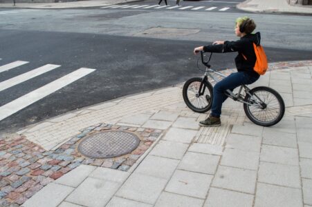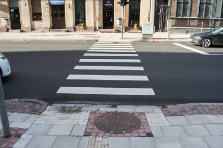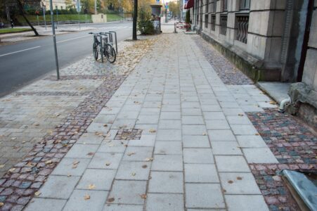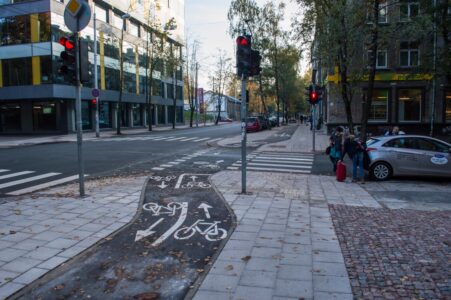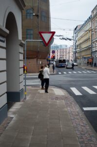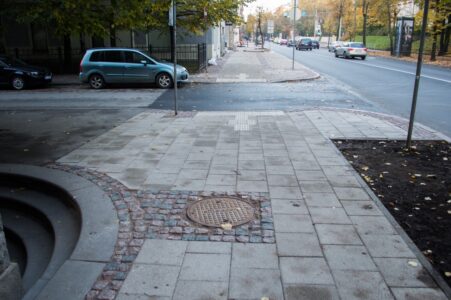 Savukārt pirms gājēju pārejām un ielu krustojumiem ir iestrādātas taktilās vadlīnijas, kuras arī neizceļas ar vienotu un kvalitatīvu izpildījumu. Vienā ielā tās krustojumā ir nepārtrauktas, savukārt citviet tās ir ar pārtraukumiem.