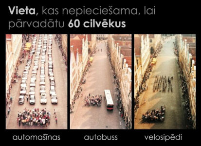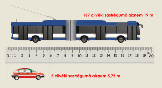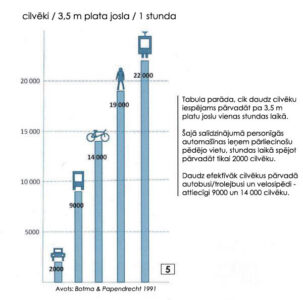 Pilsētās ir ierobežots ceļu platums, savukārt automašīnas aizņem vislielāko ceļa daļu, rēķinot uz vienu cilvēku, tieši tāpēc privātais autotransports ir visneefektīvākais transporta veids un izraisa sastrēgumus. Pa tipisku 3,5 metrus platu joslu stundā ar automašīnu var pārvietoties aptuveni 2000 cilvēku. Pa šādu pašu joslu stundā var pārvietoties 14 000 cilvēku ar velosipēdiem, savukārt sabiedriskā transporta kapacitāte stundā ir 9000 – 22 000 cilvēku, atkarībā no sabiedriskā transporta veida.